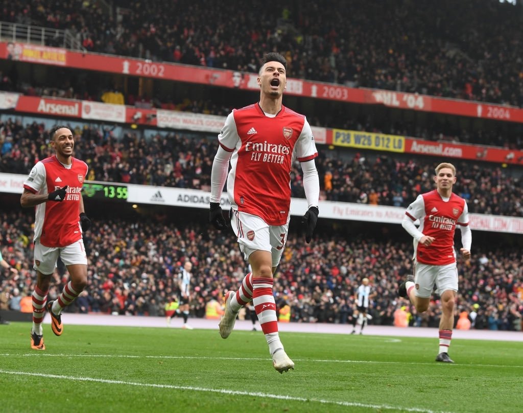 LONDON, ENGLAND – NOVEMBER 27: Gabriel Martinelli celebrates scoring the 2nd Arsenal goal during the Premier League match between Arsenal and Newcastle United at Emirates Stadium on November 27, 2021 in London, England. (Photo by Stuart MacFarlane/Arsenal FC via Getty Images)