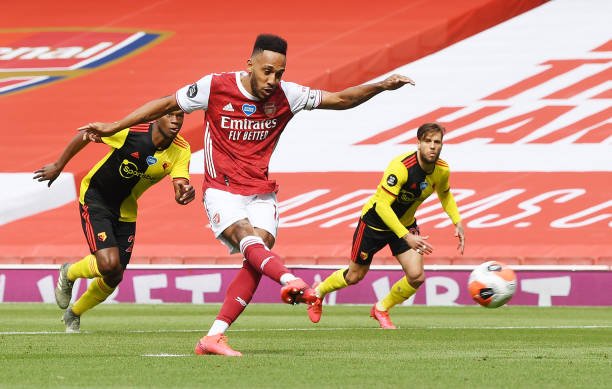 LONDON, ENGLAND - JULY 26: Pierre-Emerick Aubameyang shoots past Watford goalkeeper Ben Foster from the penalty spot to score the 1st Arsenal goal during the Premier League match between Arsenal FC and Watford FC at Emirates Stadium on July 26, 2020 in London, England. (Photo by Stuart MacFarlane/Arsenal FC via Getty Images)