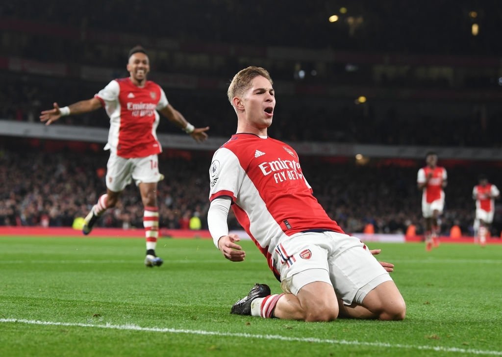 LONDON, ENGLAND - OCTOBER 22: Emile Smith Rowe celebrates scoring the 3rd Arsenal goal during the Premier League match between Arsenal and Aston Villa at Emirates Stadium on October 22, 2021 in London, England. (Photo by Stuart MacFarlane/Arsenal FC via Getty Images)