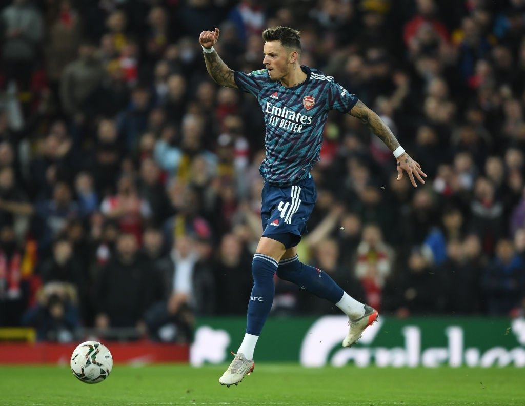 LIVERPOOL, ENGLAND - JANUARY 13: Ben White of Arsenal during the Carabao Cup Semi Final First Leg match between Liverpool and Arsenal at Anfield on January 13, 2022 in Liverpool, England. (Photo by Stuart MacFarlane/Arsenal FC via Getty Images)