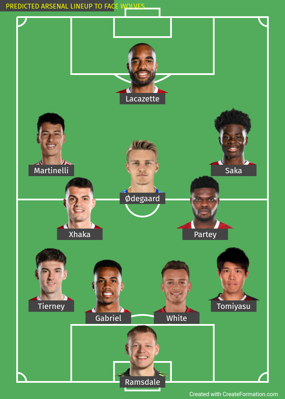 Ramsdale. Tierney, Gabriel, White, Tomiyasu, Xhaka, Partey, Martinelli, Odegaard, Saka, Lacazette