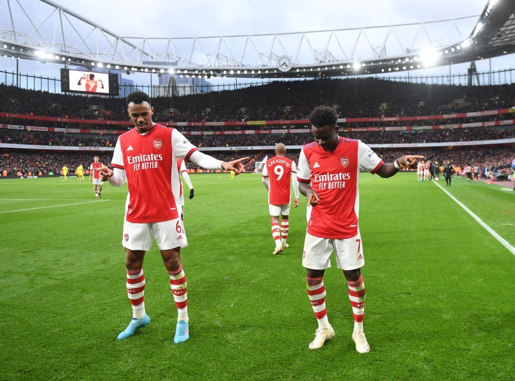 LONDON, ENGLAND - FEBRUARY 19: (R) Bukayo Saka celebrates scoring the 2nd Arsenal goal with (L) Gabriel during the Premier League match between Arsenal and Brentford at Emirates Stadium on February 19, 2022 in London, England. (Photo by Stuart MacFarlane/Arsenal FC via Getty Images)
