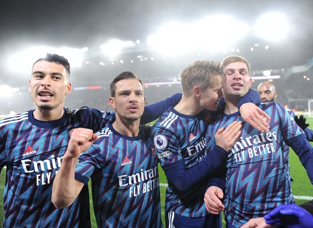 LEEDS, ENGLAND - DECEMBER 18: (R) Emile Sith Rowe celebrates scoring the 4th Arsenal goal with (L) Gabriel Martienlli, (2ndL) Cedric and (3rdL) Martin Odegaard during the Premier League match between Leeds United and Arsenal at Elland Road on December 18, 2021 in Leeds, England. (Photo by Stuart MacFarlane/Arsenal FC via Getty Images)