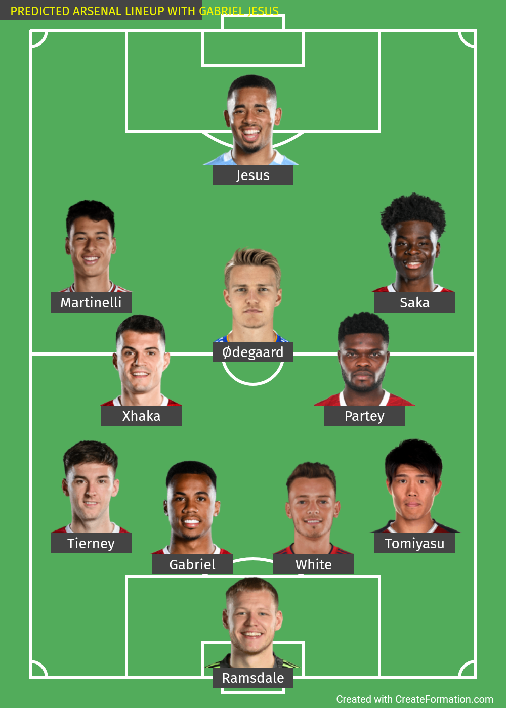 TEXT: Ramsdale, Tierney, Gabriel, White, Tomiyasu, Xhaka, Partey. Martinelli, Odegaard, Saka, Jesus