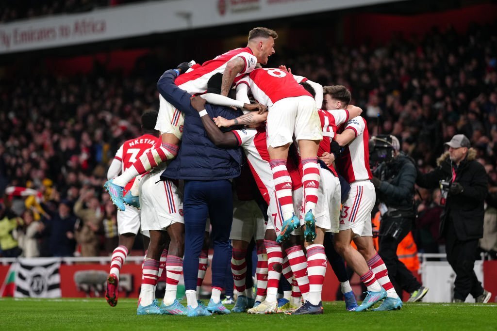 Arsenal's Alexandre Lacazette celebrates scoring their side's second goal of the game with team-mates during the Premier League match at Emirates Stadium, London. Picture date: Thursday February 24, 2022. (Photo by John Walton/PA Images via Getty Images)