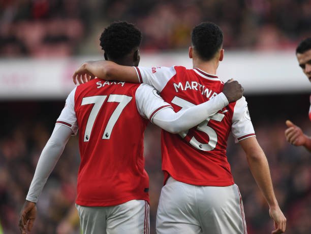 LONDON, ENGLAND - JANUARY 18: (L-R) Bukayo Saka and Gabriel Martinelli of Arsenal during the Premier League match between Arsenal FC and Sheffield United at Emirates Stadium on January 18, 2020 in London, United Kingdom. (Photo by Stuart MacFarlane/Arsenal FC via Getty Images)