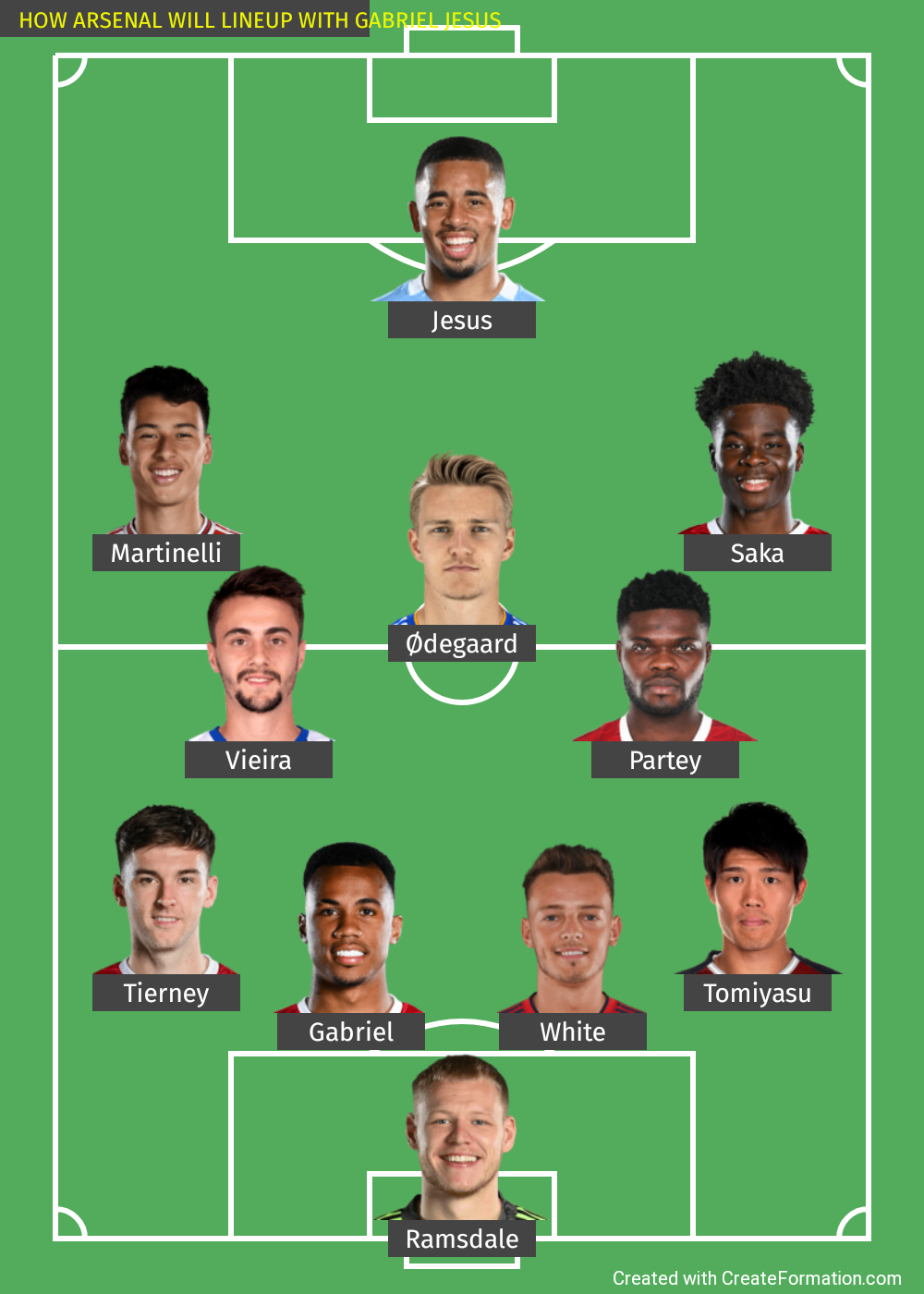 Ramsdale, Tierney, Gabriel, White, Tomiyasu, Vieira, Partey, Martinelli, Odegaard, Saka, Jesus