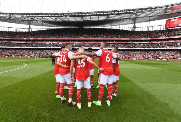 LONDON, ENGLAND - OCTOBER 01: The Arsenal team huddle before the Premier League match between Arsenal FC and Tottenham Hotspur at Emirates Stadium on October 01, 2022 in London, England. (Photo by Stuart MacFarlane/Arsenal FC via Getty Images)