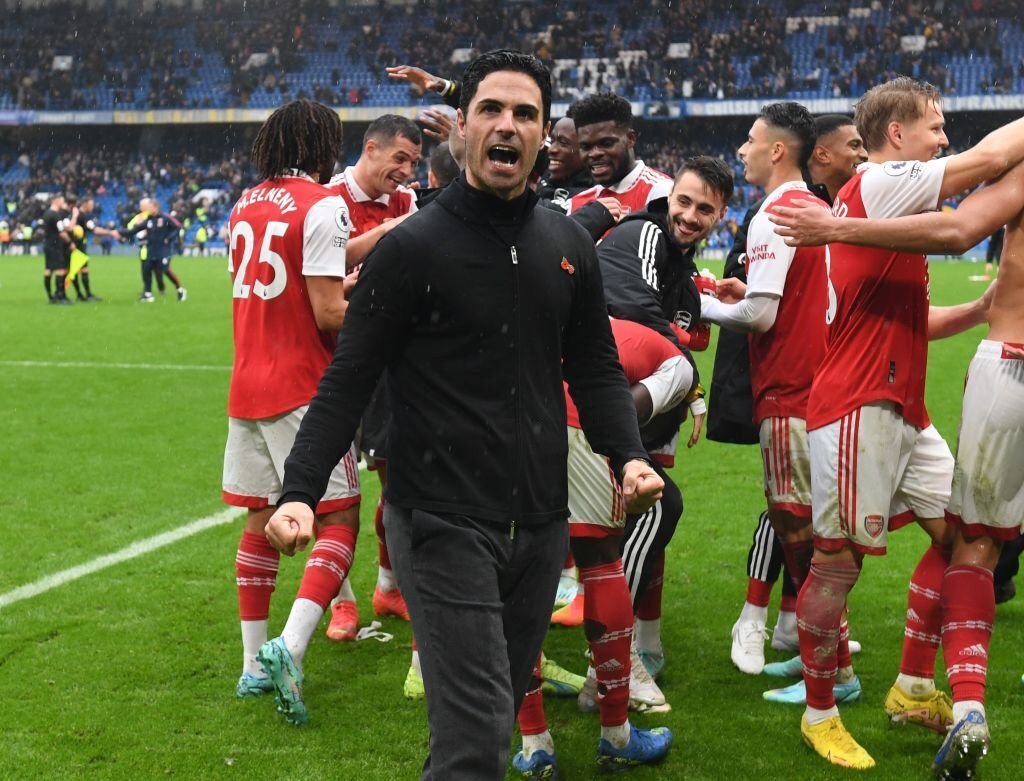 Arsenal manager Mikel Arteta celebrates after the Premier League match between Chelsea FC and Arsenal FC at Stamford Bridge on November 06, 2022 in London, England. (Photo by Stuart MacFarlane/Arsenal FC via Getty Images)