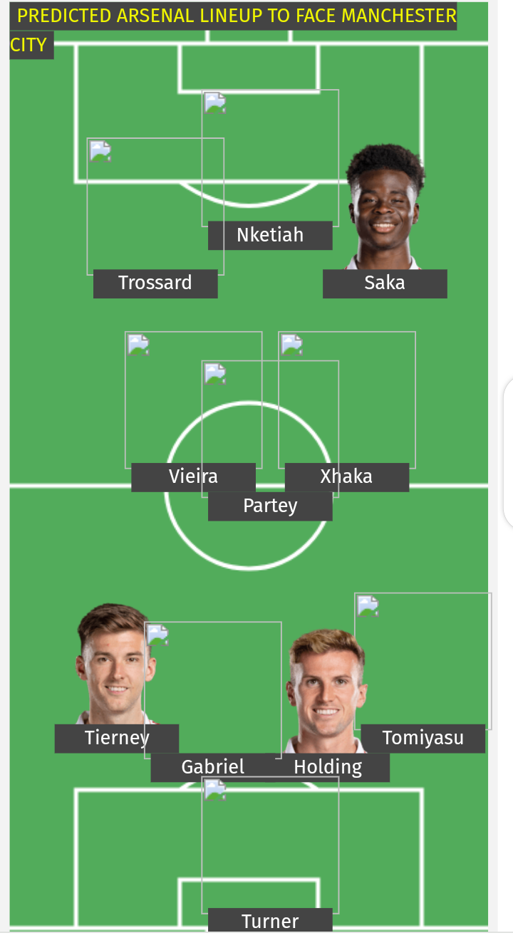 Turner, Tierney, Gabriel, Holding, Tomiyasu, Xhaka, Partey, Vieira, Trossard, Nketiah, Saka.