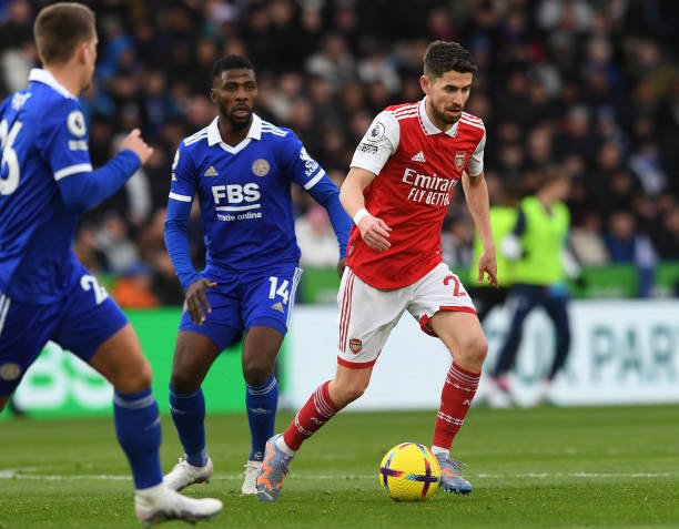 LEICESTER, ENGLAND – FEBRUARY 25: Jorginho of Arsenal takes on Kelechi Iheanacho of Leicester during the Premier League match between Leicester City and Arsenal FC at The King Power Stadium on February 25, 2023 in Leicester, England. (Photo by David Price/Arsenal FC via Getty Images)