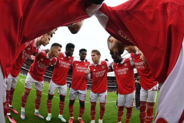 LONDON, ENGLAND – FEBRUARY 11: The Arsenal team huddle before the Premier League match between Arsenal FC and Brentford FC at Emirates Stadium on February 11, 2023 in London, England. (Photo by Stuart MacFarlane/Arsenal FC via Getty Images)