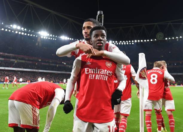 LONDON, ENGLAND - JANUARY 22: Eddie Nketiah celebrates scoring the 3rd Arsenal goal with William Saliba during the Premier League match between Arsenal FC and Manchester United at Emirates Stadium on January 22, 2023 in London, England. (Photo by Stuart MacFarlane/Arsenal FC via Getty Images)