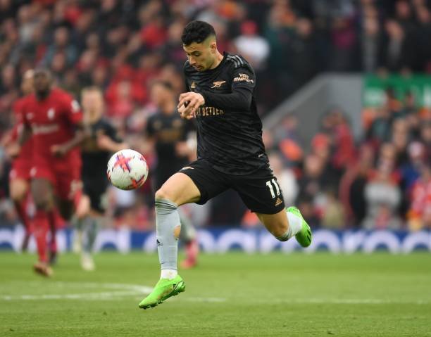LIVERPOOL, ENGLAND – APRIL 09: Gabriel Martinelli of Arsenal during the Premier League match between Liverpool FC and Arsenal FC at Anfield on April 09, 2023 in Liverpool, England. (Photo by Stuart MacFarlane/Arsenal FC via Getty Images)