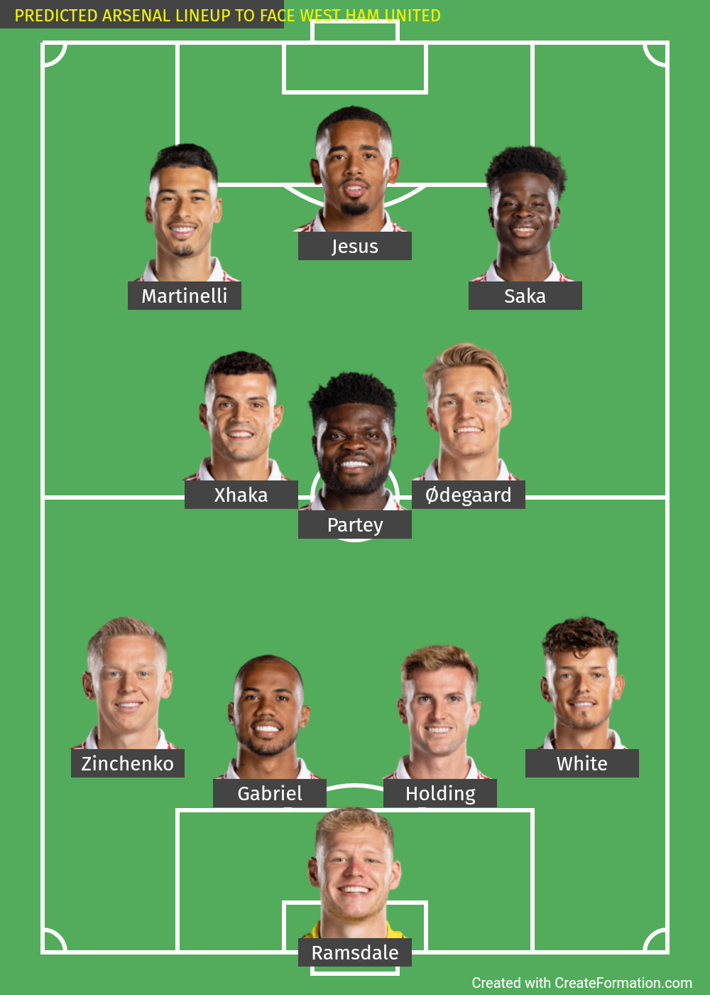 Aaron Ramsdale; Oleksandr Zinchenko, Gabriel Magalhaes, Rob Holding, Ben White; Granit Xhaka, Thomas Partey, Odegaard; Gabriel Martinelli, Gabriel Jesus, Bukayo Saka