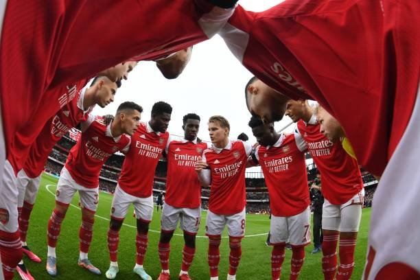 LONDON, ENGLAND - FEBRUARY 11: The Arsenal team huddle before the Premier League match between Arsenal FC and Brentford FC at Emirates Stadium on February 11, 2023 in London, England. (Photo by Stuart MacFarlane/Arsenal FC via Getty Images)