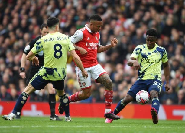 LONDON, ENGLAND – APRIL 01: Gabriel Jesus of Arsenal takes on (L) Marc Roca and (R) Luis Sinisterra of Leeds during the Premier League match between Arsenal FC and Leeds United at Emirates Stadium on April 01, 2023 in London, England. (Photo by Stuart MacFarlane/Arsenal FC via Getty Images)