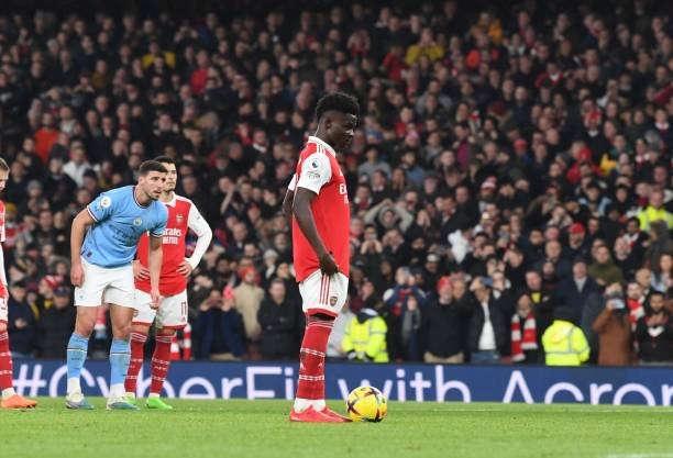 LONDON, ENGLAND – FEBRUARY 15: Arsenal’s Bukayo Saka prepares to take his penalty during the Premier League match between Arsenal FC and Manchester City at Emirates Stadium on February 15, 2023 in London, England. (Photo by Stuart MacFarlane/Arsenal FC via Getty Images)