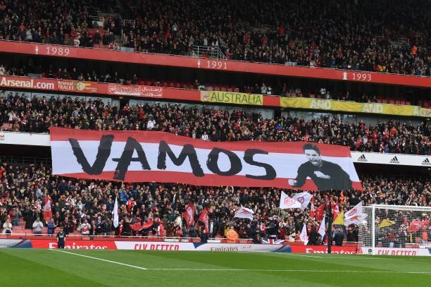 LONDON, ENGLAND – APRIL 01: Arsenal fans with a banner to support manager Mikel Arteta before the Premier League match between Arsenal FC and Leeds United at Emirates Stadium on April 01, 2023 in London, England. (Photo by Stuart MacFarlane/Arsenal FC via Getty Images)