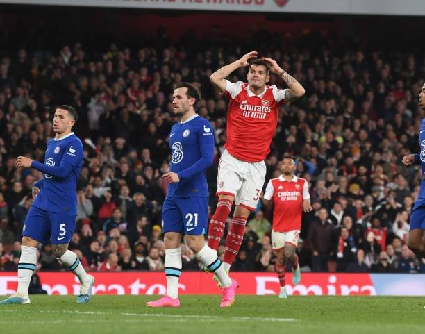 LONDON, ENGLAND – MAY 02: Granit Xhaka of Arsenal during the Premier League match between Arsenal FC and Chelsea FC at Emirates Stadium on May 02, 2023 in London, England. (Photo by Stuart MacFarlane/Arsenal FC via Getty Images)