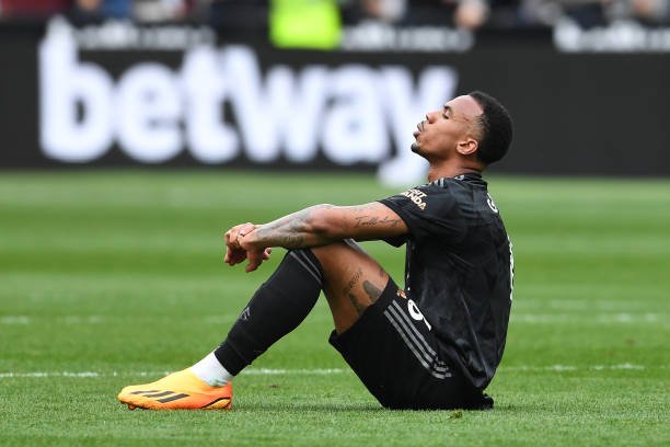 LONDON, ENGLAND – APRIL 16: Gabriel of Arsenal looks dejected during the Premier League match between West Ham United and Arsenal FC at London Stadium on April 16, 2023 in London, England. (Photo by Stuart MacFarlane/Arsenal FC via Getty Images)