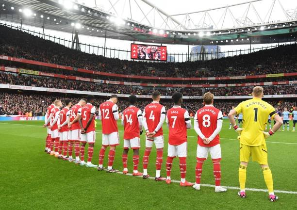 LONDON, ENGLAND – MARCH 16: The Arsenal team line up for the penalty shoot out during the UEFA Europa League round of 16 leg two match between Arsenal FC and Sporting CP at Emirates Stadium on March 16, 2023 in London, England. (Photo by Stuart MacFarlane/Arsenal FC via Getty Images)