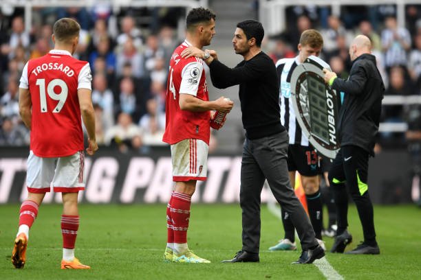NEWCASTLE UPON TYNE, ENGLAND – MAY 07: Mikel Arteta, Manager of Arsenal, speaks with Granit Xhaka of Arsenal during the Premier League match between Newcastle United and Arsenal FC at St. James Park on May 07, 2023 in Newcastle upon Tyne, England. (Photo by Stuart MacFarlane/Arsenal FC via Getty Images)