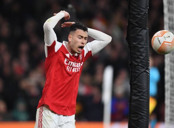 LONDON, ENGLAND - MARCH 16: Gabriel Martinelli of Arsenal during the UEFA Europa League round of 16 leg two match between Arsenal FC and Sporting CP at Emirates Stadium on March 16, 2023 in London, England. (Photo by Stuart MacFarlane/Arsenal FC via Getty Images)