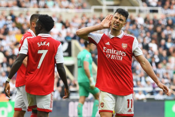 NEWCASTLE UPON TYNE, ENGLAND – MAY 07: Gabriel Martinelli of Arsenal celebrates with teammates after Fabian Schaer of Newcastle United (not pictured) concedes an own goal during the Premier League match between Newcastle United and Arsenal FC at St. James Park on May 07, 2023 in Newcastle upon Tyne, England. (Photo by Stuart MacFarlane/Arsenal FC via Getty Images)