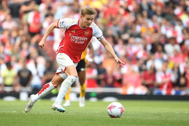 LONDON, ENGLAND – MAY 28: Martin Odegaard of Arsenal runs with the ball during the Premier League match between Arsenal FC and Wolverhampton Wanderers at Emirates Stadium on May 28, 2023 in London, England. (Photo by Stuart MacFarlane/Arsenal FC via Getty Images)