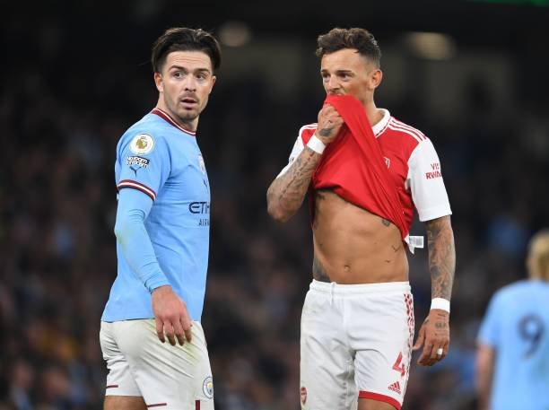 MANCHESTER, ENGLAND – APRIL 26: Ben White of Arsenal and Jack Grealish of Man City during the Premier League match between Manchester City and Arsenal FC at Etihad Stadium on April 26, 2023 in Manchester, England. (Photo by Stuart MacFarlane/Arsenal FC via Getty Images)