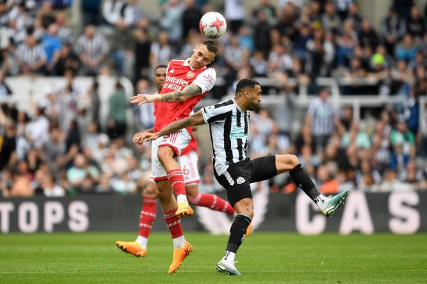 NEWCASTLE UPON TYNE, ENGLAND – MAY 07: Rob Holding of Arsenal contends for the aerial ball with Callum Wilson of Newcastle United during the Premier League match between Newcastle United and Arsenal FC at St. James Park on May 07, 2023 in Newcastle upon Tyne, England. (Photo by Stuart MacFarlane/Arsenal FC via Getty Images)