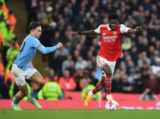 MANCHESTER, ENGLAND – APRIL 26: Thomas Partey of Arsenal breaks past Jack Grealish of Man City during the Premier League match between Manchester City and Arsenal FC at Etihad Stadium on April 26, 2023 in Manchester, England. (Photo by Stuart MacFarlane/Arsenal FC via Getty Images)