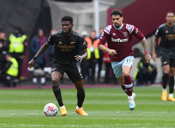 LONDON, ENGLAND – APRIL 16: Thomas Partey of Arsenal takes on Lucas Paqueta of West Ham during the Premier League match between West Ham United and Arsenal FC at London Stadium on April 16, 2023 in London, England. (Photo by David Price/Arsenal FC via Getty Images)