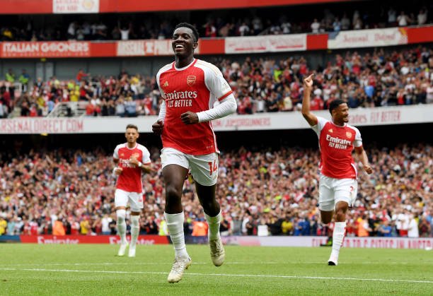 LONDON, ENGLAND – AUGUST 12: Eddie Nketiah of Arsenal celebrates after scoring the team’s first goal during the Premier League match between Arsenal FC and Nottingham Forest at Emirates Stadium on August 12, 2023 in London, England. (Photo by Stuart MacFarlane/Arsenal FC via Getty Images)