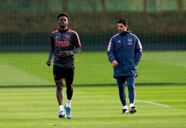 Arsenal manager Mikel Arteta (right) and Bukayo Saka during a training session at the Arsenal Training Centre, Hertfordshire. Picture date: Wednesday November 2, 2022. (Photo by John Walton/PA Images via Getty Images)