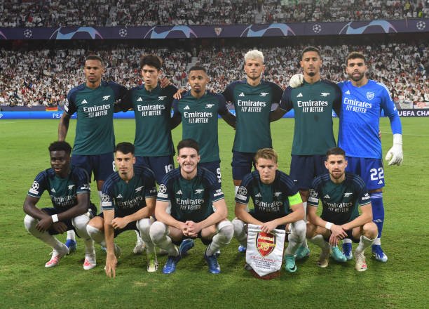 SEVILLE, SPAIN - OCTOBER 24: The Arsenal team line up before the UEFA Champions League match between Sevilla FC and Arsenal FC at Estadio Ramon Sanchez Pizjuan on October 24, 2023 in Seville, Spain. (Photo by Stuart MacFarlane/Arsenal FC via Getty Images)