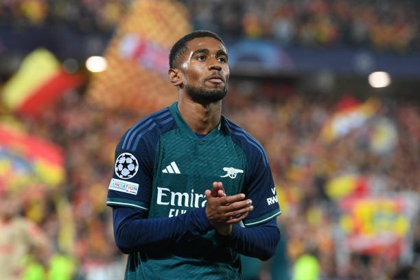 LENS, FRANCE - OCTOBER 03: Reiss Nelson of Arsenal applauds the fans during the UEFA Champions League match between RC Lens and Arsenal FC at Stade Bollaert-Delelis on October 03, 2023 in Lens, France. (Photo by Stuart MacFarlane/Arsenal FC via Getty Images)