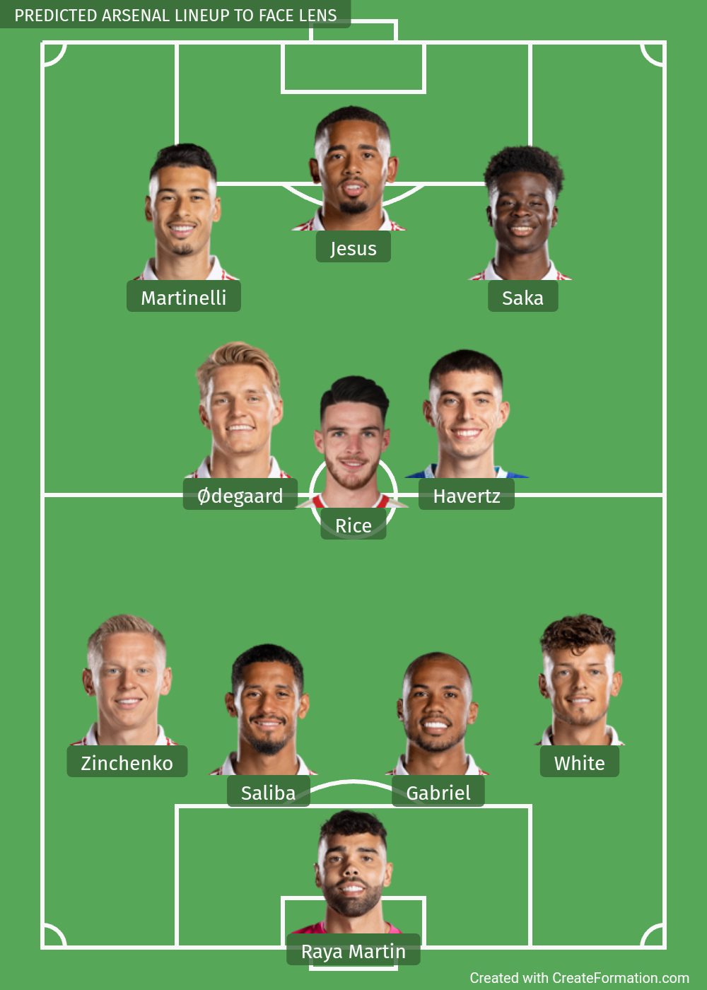 David Raya,Zinchenko, William Saliba, Gabriel Magalhaes, Ben White, Martin Odegaard, Declan Rice, Kai Havertz, Gabriel Martinelli, Gabriel Jesus, Bukayo Saka