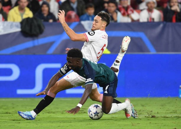 SEVILLE, SPAIN - OCTOBER 24: Bukayo Saka of Arsenal challenged by Nemanja Gudelj of Seville during the UEFA Champions League match between Sevilla FC and Arsenal FC at Estadio Ramon Sanchez Pizjuan on October 24, 2023 in Seville, Spain. (Photo by Stuart MacFarlane/Arsenal FC via Getty Images)