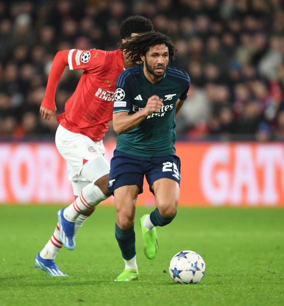 EINDHOVEN, NETHERLANDS – DECEMBER 12: Mo Elneny of Arsenal during the UEFA Champions League match between PSV Eindhoven and Arsenal FC at Philips Stadion on December 12, 2023 in Eindhoven, Netherlands. (Photo by Stuart MacFarlane/Arsenal FC via Getty Images)