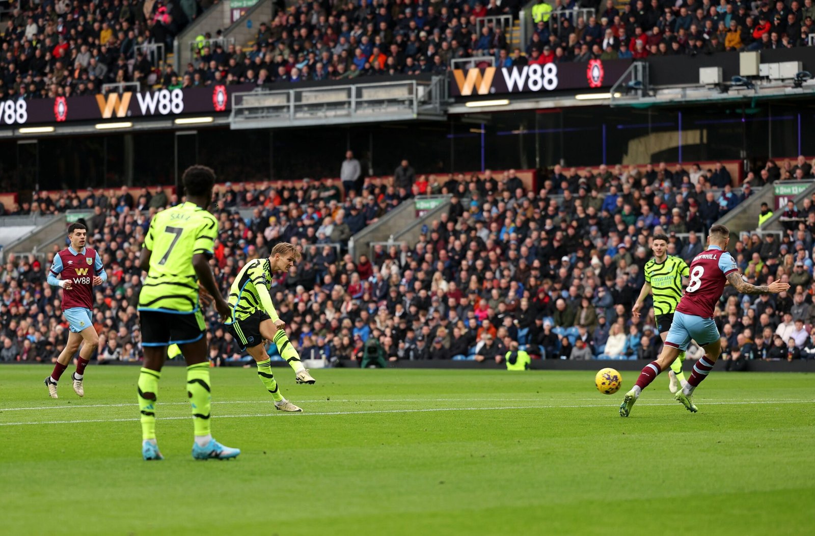 In a scintillating display of dominance, Arsenal showcased their attacking prowess and defensive solidity in a resounding 5-0 victory over Burnley at Turf Moor. The Gunners wasted no time in asserting their authority, with Odegaard opening the scoring just four minutes into the game, firing home a precise finish from Martinelli’s cutback. As the first half drew to a close, Saka doubled Arsenal’s lead from the penalty spot after Assignon’s foul on Trossard, sending the ball past a helpless Trafford.