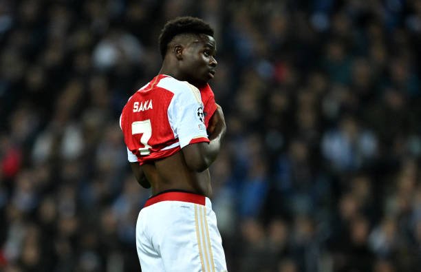 PORTO, PORTUGAL – FEBRUARY 21: Bukayo Saka of Arsenal reacts during the UEFA Champions League 2023/24 round of 16 first leg match between FC Porto and Arsenal FC at Estadio do Dragao on February 21, 2024 in Porto, Portugal. (Photo by Stuart MacFarlane/Arsenal FC via Getty Images)