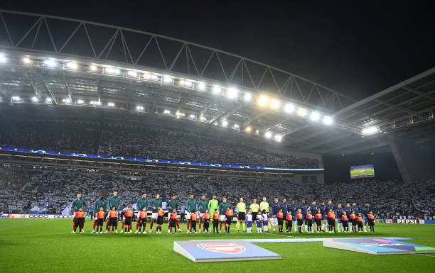 PORTO, PORTUGAL - FEBRUARY 21: The Arsenal and Porto teams line up before the UEFA Champions League 2023/24 round of 16 first leg match between FC Porto and Arsenal FC at Estadio do Dragao on February 21, 2024 in Porto, Portugal. (Photo by Stuart MacFarlane/Arsenal FC via Getty Images)