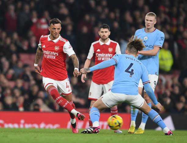LONDON, ENGLAND - FEBRUARY 15: Ben White of Arsenal takes on Kalvin Phillips of Man City during the Premier League match between Arsenal FC and Manchester City at Emirates Stadium on February 15, 2023 in London, England. (Photo by Stuart MacFarlane/Arsenal FC via Getty Images)