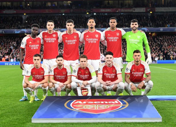 LONDON, ENGLAND - MARCH 12: The Arsenal team line up before the UEFA Champions League 2023/24 round of 16 second leg match between Arsenal FC and FC Porto at Emirates Stadium on March 12, 2024 in London, England. (Photo by Stuart MacFarlane/Arsenal FC via Getty Images)