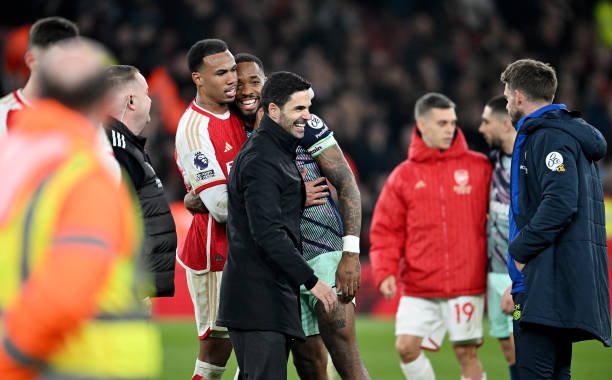 LONDON, ENGLAND - MARCH 09: Mikel Arteta, Manager of Arsenal, and Gabriel of Arsenal speak with Ivan Toney of Brentford after the Premier League match between Arsenal FC and Brentford FC at Emirates Stadium on March 09, 2024 in London, England. (Photo by Stuart MacFarlane/Arsenal FC via Getty Images)
