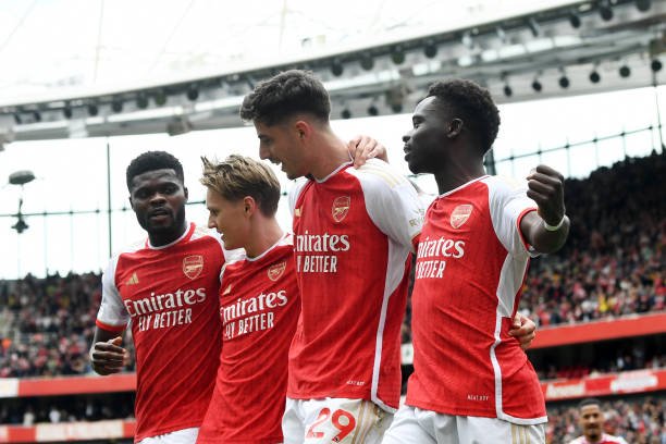 LONDON, ENGLAND - MAY 04: Bukayo Saka of Arsenal celebrates scoring his team's first goal from a penalty kick with teammates Kai Havertz, Martin Odegaard and Thomas Partey during the Premier League match between Arsenal FC and AFC Bournemouth at Emirates Stadium on May 04, 2024 in London, England. (Photo by Stuart MacFarlane/Arsenal FC via Getty Images)