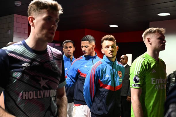 LONDON, ENGLAND - MARCH 09: Gabriel, William Saliba and Ben White and Aaron Ramsdale of Arsenal look on in the players' tunnel prior to the Premier League match between Arsenal FC and Brentford FC at Emirates Stadium on March 09, 2024 in London, England. (Photo by Stuart MacFarlane/Arsenal FC via Getty Images)