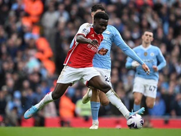MANCHESTER, ENGLAND – MARCH 31: Bukayo Saka of Arsenal challenged by Jasko Gvardiol of Man Cityduring the Premier League match between Manchester City and Arsenal FC at Etihad Stadium on March 31, 2024 in Manchester, England. (Photo by Stuart MacFarlane/Arsenal FC via Getty Images)
